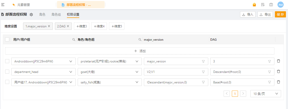 dimensions 属性包含权限方案关联的维度信息,顺序与权限设置界面中顺序保持一致