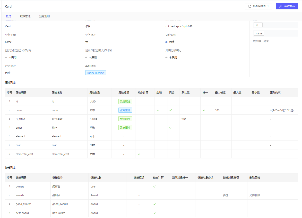 在当前样例的主视图中,创建了3个对象,分别是Card、User和Award对象,属性概览如下: