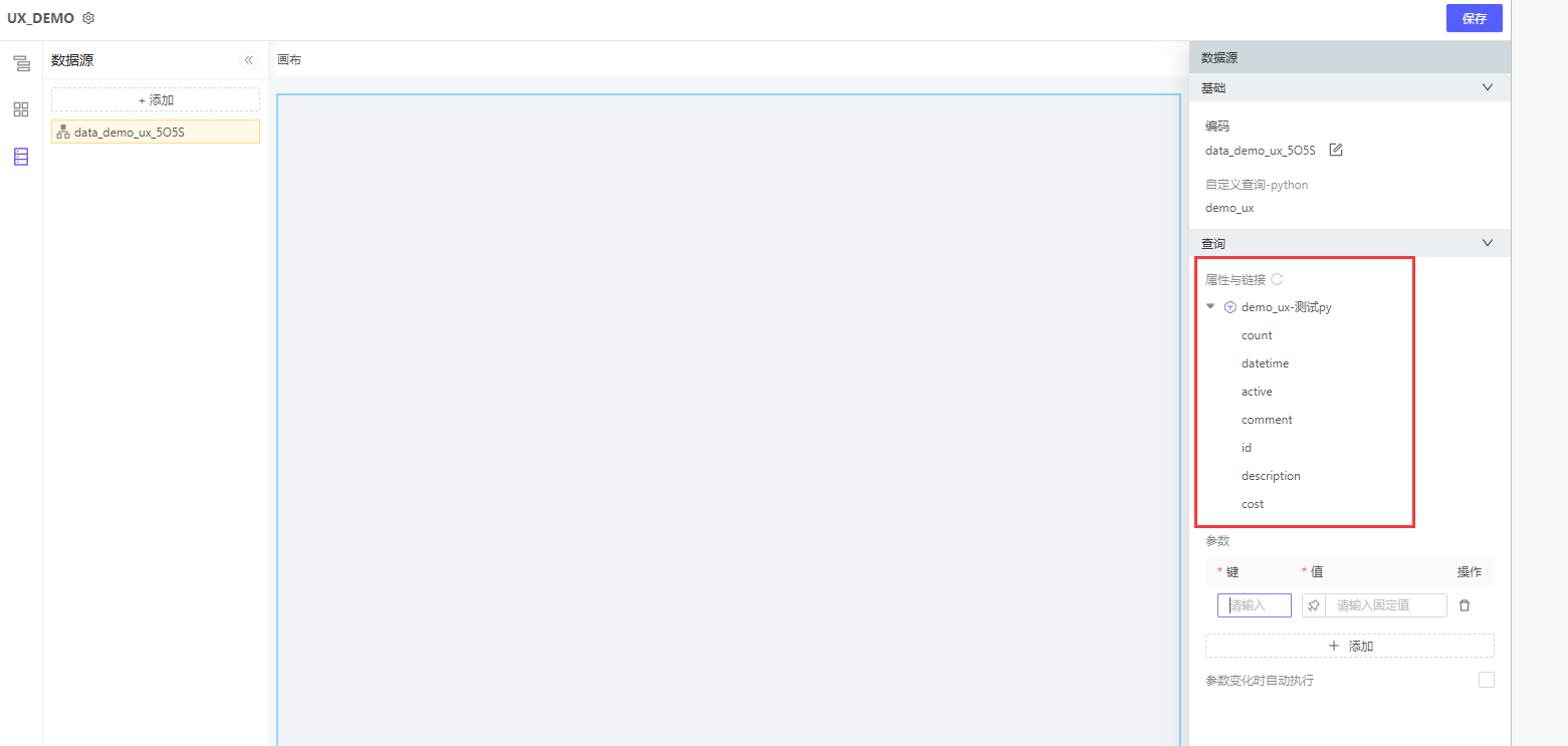 在UX中增加代码对应的Python元素作为数据源后,可见字段信息被识别: