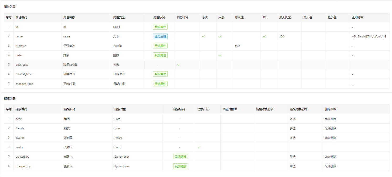 鉴于 DeepModel 面向对象的设计下,除了寻常结构型存储结构的标量值,对应了 DeepModel 的属性外,还有链接(Link),用于标识对象与对象间的关系,例如本样例应用内的User对象与CardAward对象间具有若干链接